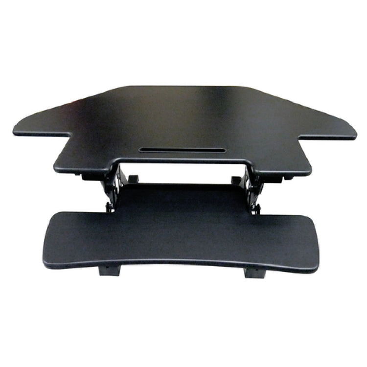 The Omcan 44561 Ergonomic Corner Desk Platform Sit & Stand Adjustable Height is a versatile solution designed to meet the dynamic needs of modern workspaces. With a maximum height adjustment of 19-11/16 inches, this desk platform allows users the flexibility to switch between sitting and standing positions, promoting better posture and comfort throughout the workday. The platform is equipped with a 28.74-inch wide by 7.5-inch deep retractable keyboard tray, accommodating various keyboard sizes while ensuring ease of use and space efficiency. Its advanced gas-lift spring mechanism provides smooth and effortless height transitions, enhancing user experience. The sleek black design not only complements a wide range of office aesthetics but also maximizes corner space utilization, making it ideal for both home offices and corporate environments. Tailored for the ergonomically conscious, the Omcan 44561 supports productivity and well-being, catering to diverse market segments from individual remote workers to larger organizational settings. This desk platform combines functionality with style, offering a practical and adaptable furniture choice for enhancing any workspace setup.