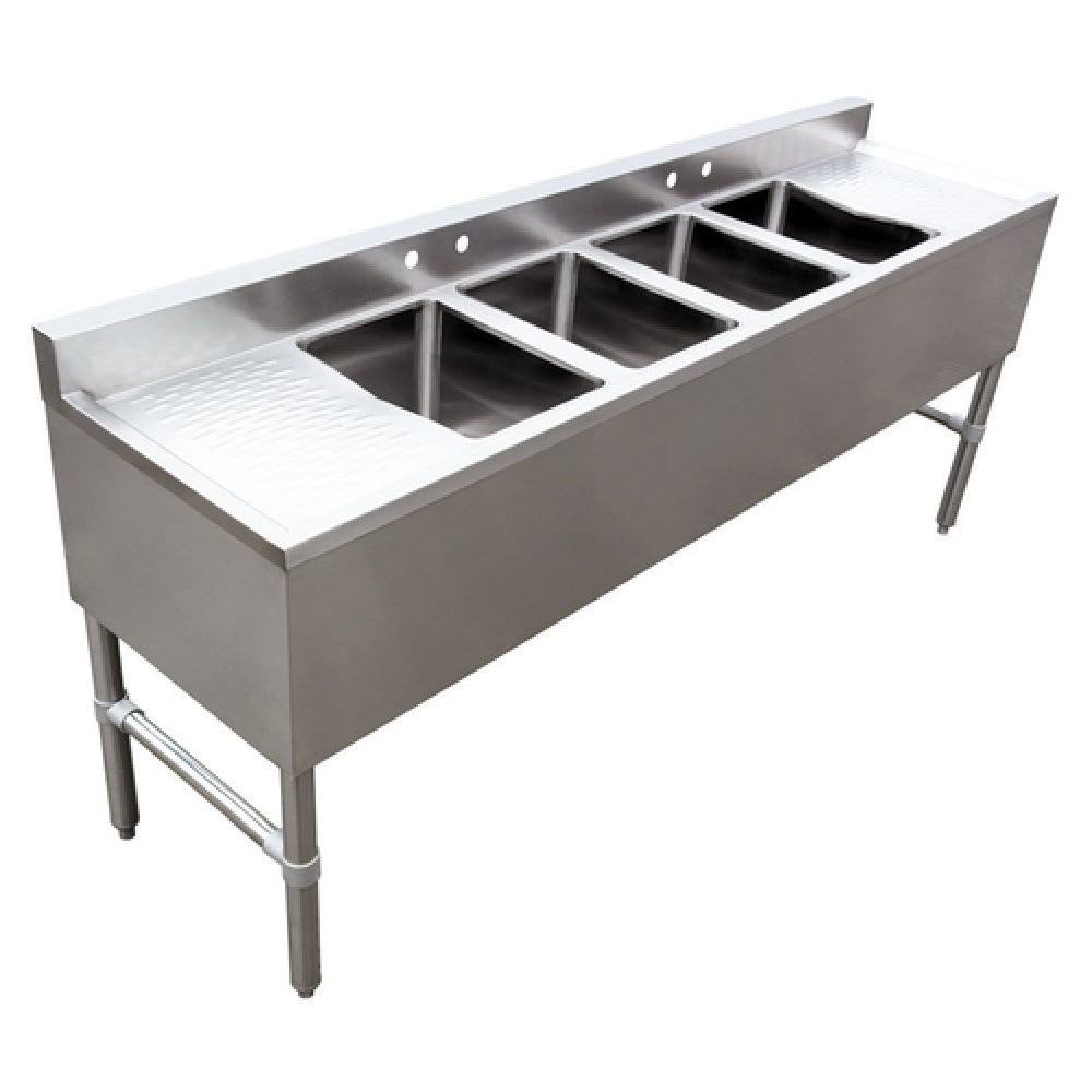 The Omcan 44603 (44603) Under Bar Sink is a versatile solution designed for commercial use, offering four compartments each measuring 10" x 14" x 10". This configuration is particularly beneficial for establishments requiring efficient washing and rinsing operations, such as bars and restaurants. The sink is engineered with two 1" diameter center faucet holes that are spaced 4" apart, accommodating a variety of faucet setups to match your specific needs. A 3" backsplash protects surrounding areas from water damage, adding functionality and cleanliness to its design. Constructed from durable stainless steel, the sink ensures longevity and resistance to corrosion, which is essential in high-use environments. The sink also includes left and right drain boards, providing ample space for drying and further enhancing workflow efficiency. Supported by galvanized H-frame legs with adjustable bullet feet, the Omcan 44603 Under Bar Sink maintains stability and allows for customizable leveling on uneven surfaces. This sink is a highly specialized piece of equipment designed to meet the rigorous demands of the food and beverage industry, providing a reliable and efficient solution for under-bar cleaning needs.