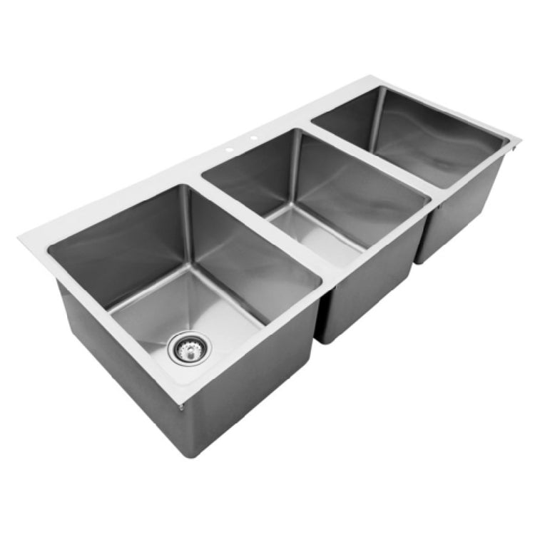The Omcan 44604 (44604) Drop-In Sink Three Compartment 16" X 20" X 12" Deep Compartments is a highly functional and durable solution designed for commercial kitchen environments, particularly those requiring efficient space management and sanitation capabilities. Made from stainless steel, this sink ensures both longevity and ease of cleaning, making it ideal for high-demand settings such as restaurants, cafes, and catering businesses. Each of the three compartments measures 16 inches in length, 20 inches in width, and 12 inches in depth, providing ample space for multitasking, whether that's washing, rinsing, or sanitizing dishes and utensils. It is equipped with a 3-1/2 inch drain basket, which helps in effectively filtering out debris, thus maintaining a cleaner workspace. The drop-in design allows for seamless integration into various countertop setups, making it versatile and adaptable to different kitchen layouts. The Omcan 44604's rugged construction and practical dimensions make it a valuable asset for any food service operation looking to optimize their workflow and maintain high standards of hygiene.