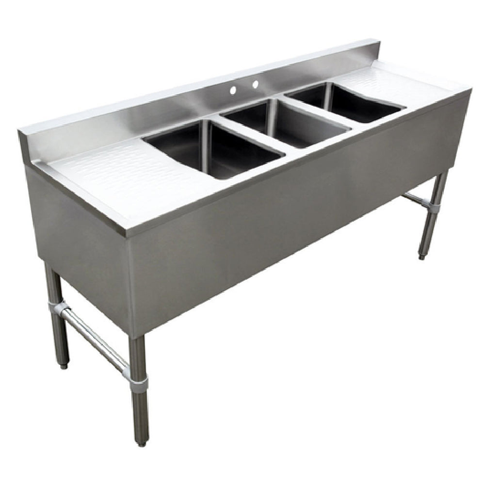 The Omcan 44627 Underbar Sink, identifiable by its product code (44627), is a versatile and efficient solution for commercial kitchens and bars, well-suited for both small and large scale operations. This sink features three individual compartments, each measuring 10 inches by 14 inches by 10 inches, providing ample space for washing, rinsing, and sanitizing dishes or other culinary tools. The sink is equipped with two central faucet holes, each 1 inch in diameter and spaced 4 inches apart, allowing for easy installation of a compatible faucet system. A 3-inch backsplash is incorporated to protect walls and surrounding areas from splashes and spills, maintaining a clean and safe work environment. The sink includes both left and right drain boards, enhancing its utility by offering additional space for drying or prepping. Constructed with high-quality stainless steel, this sink ensures long-lasting durability and resistance to corrosion, essential for rigorous daily use. The galvanized H-frame legs provide sturdy support and are designed with adjustable bullet feet, allowing for stability on uneven surfaces. The Omcan 44627 is an ideal choice for establishments seeking a reliable and adaptable underbar sink that supports efficient workflow and meets the practical needs of various market segments within the food service industry.