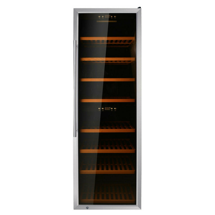 The Omcan 45258 (WC-CN-0181-D) Wine Cooler showcases an impressive bottle capacity, accommodating up to 181 bottles, making it a perfect choice for wine enthusiasts and commercial establishments alike. With its dual-zone feature, this wine cooler offers a versatile temperature range of 37.4°F to 71.6°F (3°C to 22°C), ensuring optimal storage conditions for different types of wines. The unit maintains an inner humidity level between 40% and 60% to preserve the wine's quality and integrity. Powered by R134a refrigerant, it operates efficiently at 115v/60, drawing 2.4 amps and 160 watts. The cooler is equipped with a standard NEMA 5-15P cord, ensuring compatibility with most electrical outlets. Moreover, the Omcan 45258 is cSGSus certified, ensuring it meets stringent safety and performance standards. Shipped on a pallet for secure transportation, this wine cooler is designed to meet the demands of both home and commercial use with its robust storage capacity and precise temperature control. Its advanced features cater to the needs of wine collectors, restaurants, and bars, providing a reliable solution for wine storage and preservation.