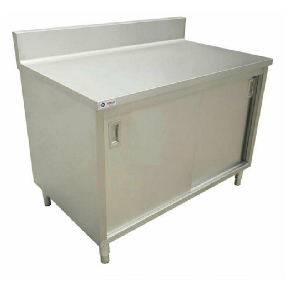 The Omcan 45281 (45281) Work Table Cabinet Base With Sliding Doors 48"W X 30"D X 36"H is a meticulously crafted piece of equipment designed for versatility and efficiency in professional settings. This work table features a cabinet base equipped with sliding doors, providing easy access to storage and enhancing workspace organization. The dimensions - 48 inches wide, 30 inches deep, and 36 inches high - make it a substantial addition to any kitchen or workshop. Constructed from 18-gauge 430 stainless steel, the table includes a hat channel, as well as back, side, bottom, and intermediate shelves, ensuring durability and stability. The top shelf is made from 16-gauge 430 stainless steel and includes a 6-inch backsplash, offering an additional layer of protection and practicality. The stainless steel legs come with adjustable bullet feet, allowing for stability on uneven surfaces. The table is NSF certified, emphasizing its compliance with industry health and safety standards. Shipped on a pallet for secure transportation, the Omcan 45281 is ideal for various industry sectors, including commercial kitchens, laboratories, and manufacturing environments, due to its robust construction and thoughtful design, accommodating the demanding needs of diverse professional spaces.