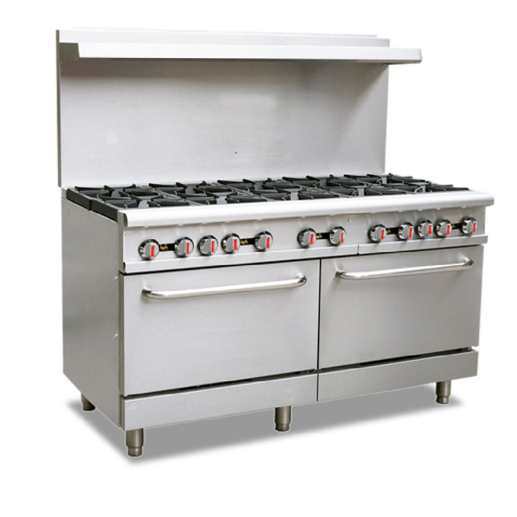 The Omcan 46027 (CE-CN-1524-R) Commercial Range Natural Gas 60"W is engineered for high-demand culinary environments, offering an efficient and versatile solution for both large and small-scale operations. This robust commercial range features ten open burners, each equipped with durable cast iron grates, enabling diverse cooking functions simultaneously, while catering to various cooking styles. The dual standard ovens beneath provide additional cooking versatility with a substantial total output of 362,000 BTU, ensuring rapid and consistent heat distribution. Designed with a stainless steel front, sides, and back riser, along with an integrated shelf, this range is both durable and aesthetically pleasing, suitable for a professional kitchen setting. Its removable crumb tray simplifies maintenance, promoting cleanliness and operational efficiency. Moreover, the range includes adjustable legs for stable installation on uneven surfaces. Safety and compliance are emphasized with cETLus and ETL-Sanitation certifications, assuring adherence to necessary standards. The Omcan 46027 is shipped securely on a pallet, underpinning its readiness for immediate integration into commercial settings. This range is an optimal choice for restaurant kitchens, catering businesses, and other foodservice establishments that require reliable and high-capacity cooking equipment.