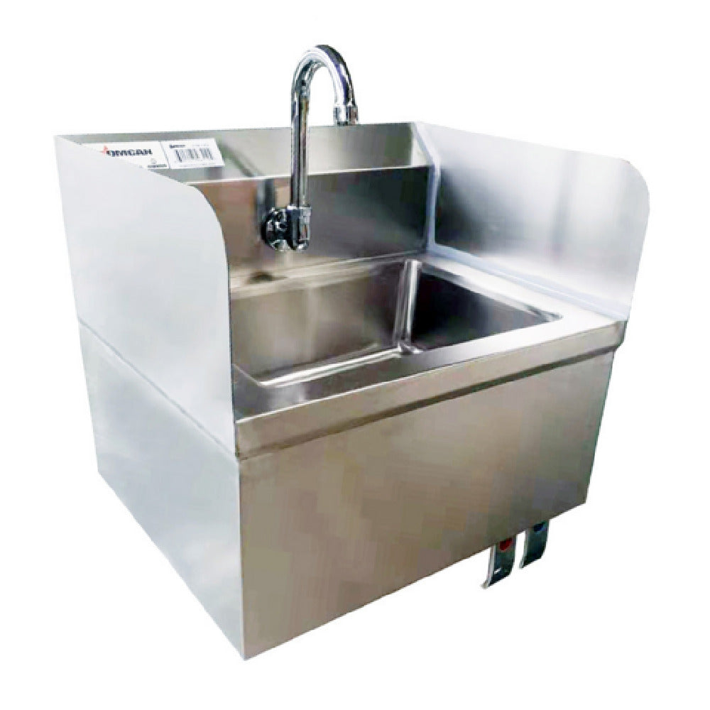 The Omcan 46512 Hand Sink With Knee Valve Assembly & Side Splashes is engineered for efficient use in commercial kitchens and food service environments, where hygiene and convenience are paramount. This unit features a compact 10" x 14" x 5" bowl, making it a suitable choice for facilities with limited space. Crafted from 18-gauge, 304 stainless steel, it ensures long-lasting durability and resistance to corrosion. The integration of a knee valve assembly allows for hands-free operation, enhancing sanitary practices by minimizing hand contact. Equipped with a 4" low-lead gooseneck faucet, the sink facilitates easy access and water flow management while adhering to safety standards. The inclusion of side splashes effectively reduces water spillage, maintaining a clean and safe workspace. A 1-1/2" drain basket is incorporated to ensure efficient water drainage and debris collection. Certified by NSF, the Omcan 46512 hand sink complies with rigorous public health and safety standards, making it an essential asset for restaurants, cafeterias, and other food-related industries that require reliable and sanitary handwashing solutions. This product represents a blend of practicality and robust construction, tailored to meet the diverse needs of professionals in the food service sector.