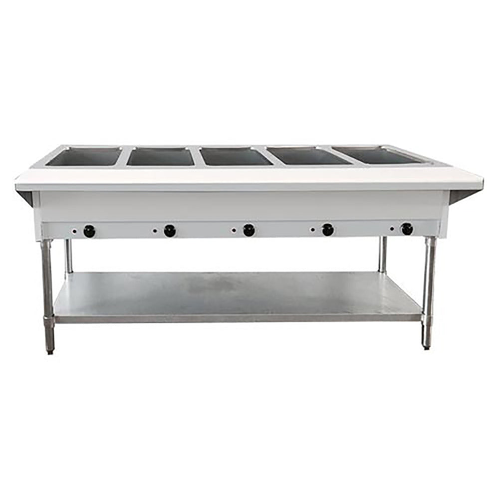The Omcan 46648 (FW-CN-0005-FH) Electric Open Well Steam Table is a versatile unit measuring 72"W x 30"D x 34"H, engineered for efficient food service operations. This model features a generous capacity, accommodating up to five full-size pans (pans not included), each governed by independent infinite controls for precise temperature management. Constructed from durable stainless steel, the steam table exhibits robust durability and is equipped with adjustable stainless steel feet to ensure stability on various surfaces. A strategically placed undershelf offers additional storage space, enhancing organizational efficiency. For added convenience, a removable polyethylene cutting board is included, facilitating easy food preparation and service. The unit operates on a powerful 5 kW, 240v/60/1-ph electrical system, drawing 20.83 amps, and is fitted with a NEMA 6-30P cord for reliable power connectivity. Certified by cETLus and ETL-Sanitation, this steam table meets rigorous safety and sanitation standards, making it an excellent choice for restaurants, catering services, and other food service establishments. Shipped on a pallet, the Omcan 46648 is engineered to deliver high performance and reliability in demanding commercial environments, ensuring it meets the diverse needs of various market segments within the industry.