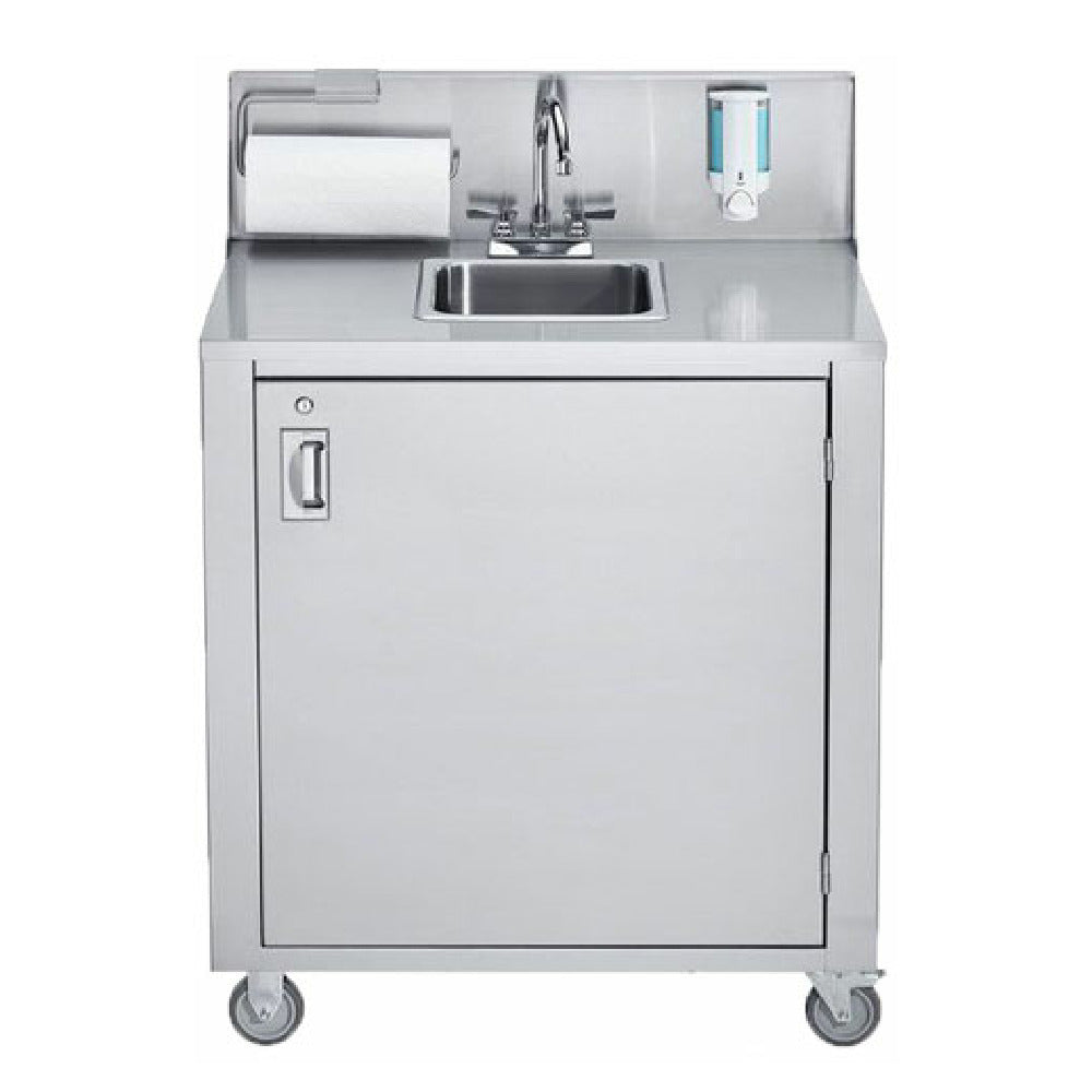 The Omcan 46788 Portable Hand Sink is a versatile and practical solution designed for various environments requiring mobile handwashing facilities. Featuring a compact 12" x 14" x 6" bowl with a 9-1/2" backsplash, this unit is crafted from durable stainless steel, ensuring longevity and reliability. It includes a deck-mounted faucet with a 4" center and 4" gooseneck spout for easy access to water. The hand sink is equipped with wall-mounted soap and towel dispensers for convenience. It has two removable 5-gallon fresh cold water tanks and two removable 7-1/2-gallon waste tanks, each with a 37" hose, offering ample water capacity and efficient waste management. The 120V 2-gallon water heater tank and pump ensure warm water availability, enhancing hygiene in diverse settings. The cabinet base is mounted on 5" plate casters, two of which have brakes, allowing for stability and mobility. The unit also features a 1-1/2" drain basket to manage water flow. Certified by cCSAus and NSF, the Omcan 46788 Portable Hand Sink meets high standards of safety and sanitation, making it ideal for catering services, outdoor events, and other temporary setups requiring compliant handwashing stations.