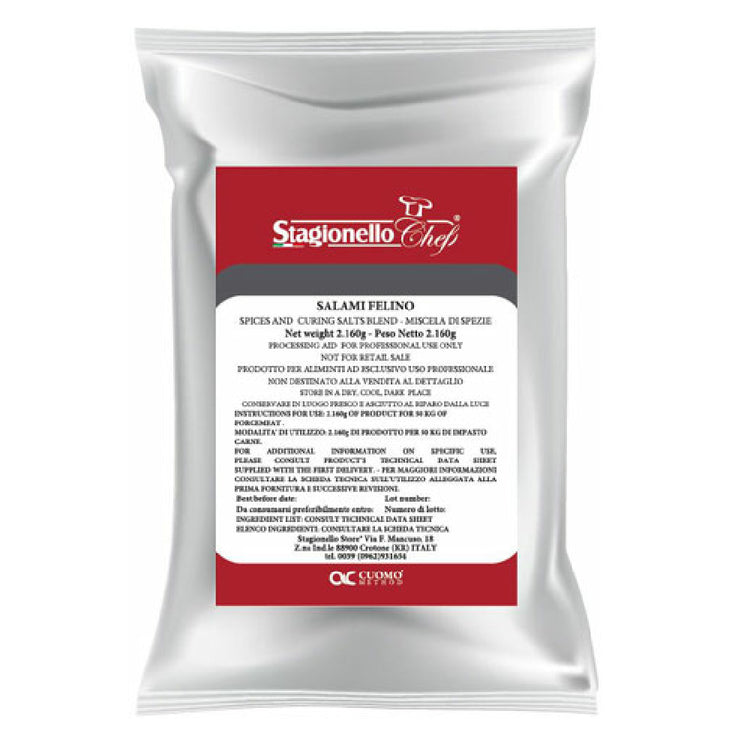 The Omcan 47002 (47002) Curing Salts and Spice Blends for Rapid Fermentation Salami Felino Salami 2.16 kg/bag is a specialized product designed to enhance the fermentation process of salami, specifically Felino salami. This product is presented in a convenient 2.16 kg bag, making it suitable for both small-scale and large-scale operations within the charcuterie industry. This curing solution is tailored for rapid fermentation, which is essential for producing high-quality salami with the desired flavor and texture. The unique formulation of curing salts and spice blends provides an optimal environment for consistent and efficient fermentation. This blend is particularly beneficial for producers seeking to create authentic Felino salami, a traditional Italian delicacy, by ensuring the characteristic taste and quality. The precise combination of ingredients in the Omcan 47002 is engineered to meet the specific demands of meat processors, enhancing both production speed and product authenticity. This product is ideal for artisanal meat producers and commercial meat processing facilities aiming to deliver superior fermented meat products. The Omcan 47002 thus represents a critical component in the meat curing industry, supporting various market segments with its specialized application in salami production.