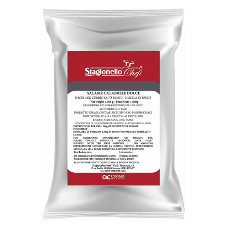 The Omcan 47004 - Curing Salts and Spice Blends for Rapid Fermentation Salami Sweet Calabrese Salami 1 kg / bag is a high-quality product designed to enhance the meat curing process, specifically tailored for salami production. It comes in a convenient 1 kg bag, providing a precise blend of curing salts and spices that facilitate rapid fermentation, making it an essential for meat processing industries focused on efficiency and flavor consistency. This product is particularly valuable for artisanal and commercial salami makers aiming to produce Sweet Calabrese Salami with authentic taste profiles. Its formulation supports the fermentation process, ensuring robust flavor development while maintaining safety and meat quality standards. The Omcan 47004 is ideal for various market segments, including gourmet delis, specialty meat producers, and larger food manufacturing operations, where the emphasis is on producing high-quality salami in less time. This product addresses the need for consistency and reliability in flavor production, making it a strategic choice for producers dedicated to maintaining traditional flavors while benefiting from modern technological advancements in meat curing. Its precise composition underscores its importance in achieving optimal results in salami fermentation processes.
