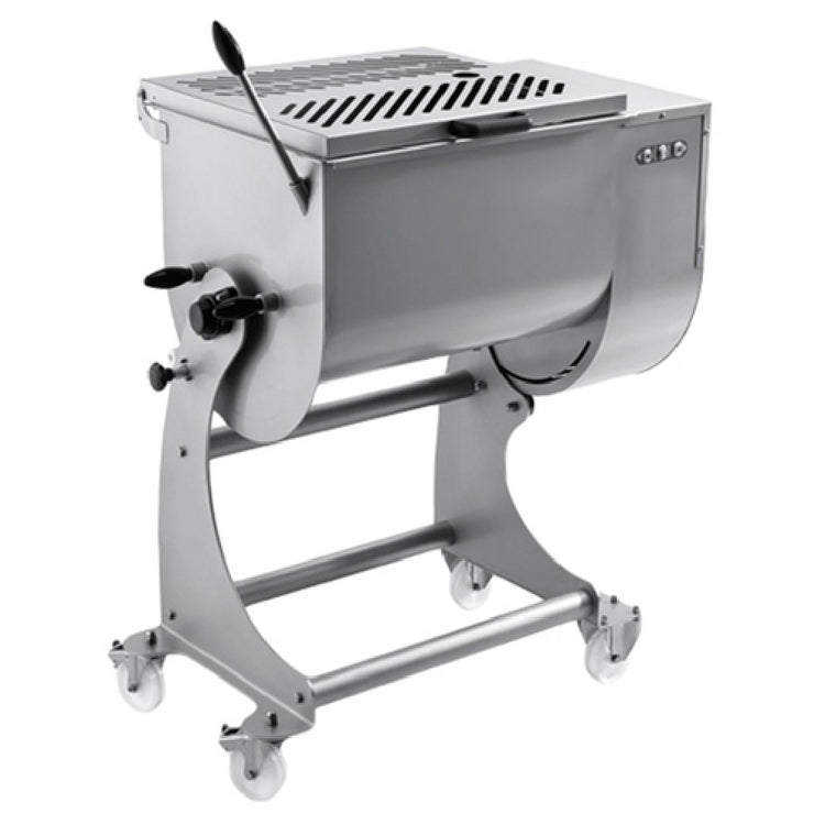 The Omcan 47134 (MM-IT-0050) Meat Mixer Floor Model Electric is a high-capacity industrial mixer designed for efficiency and safety in meat processing applications. With a substantial 50 kg (88 liter) capacity, this floor model is built to handle large quantities of meat with ease. The unit features a 16.5" x 19.7" tilting tank that includes an automatic locking system for secure operation. Safety is further enhanced with a safety lock and a stainless steel cover equipped with a safety microswitch. This mixer is constructed from durable 304 stainless steel, ensuring longevity and hygiene in food processing environments. The design incorporates two removable stainless steel mixing arms to facilitate thorough mixing and easy cleaning. Mobility is maximized with swivel casters that include locks to stabilize the unit during use. Powered by two 0.5 HP motors, this mixer operates on a 220v/60/1-ph electrical supply, making it suitable for a wide range of commercial settings. The Omcan 47134 is certified by cETLus and CE, affirming its compliance with industry standards. Manufactured in Italy, this mixer is shipped on a pallet, ensuring it reaches your facility in pristine condition.