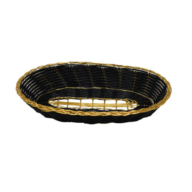 The Omcan 47193 Woven Basket, measuring 9" in diameter, 4.25" in width, and 2" in height, is a sophisticated storage solution that combines functionality with aesthetic appeal. Featuring a long oval shape and adorned with a distinguished golden trim, this basket is designed in an elegant black finish that enhances its visual appeal across a range of settings. The woven construction not only adds to its visual allure but also ensures durability, making it a reliable choice for both commercial and domestic environments. Its compact dimensions make it an ideal fit for countertops or display shelves, making it versatile for various uses, such as organizing small items or presenting products attractively in retail spaces. This basket serves multiple segment markets within the hospitality and retail industries, offering a blend of practicality and style. The Omcan 47193 is particularly suited for establishments looking to upgrade their presentation and organization aesthetics with a touch of elegance. Its unique combination of size and design elements underscores its value as a sophisticated yet practical accessory in both commercial and residential contexts, balancing form and function seamlessly.