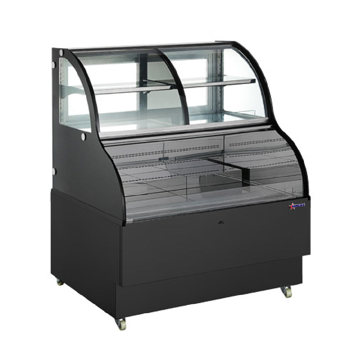 The Omcan 47277 (47277) Dual Service Open Display Case Floor Model Bottom Mount Self-contained Refrigeration is a versatile and efficient solution for various commercial refrigeration needs. With a substantial capacity of 16.53 cu. ft. (468 liters), it provides ample space for displaying a variety of products. The temperature range of 35.6°F to 50°F (2°C to 10°C) ensures optimal conditions for preserving freshness. Designed with an enclosed top shelf and a curved glass front, it offers a visually appealing presentation while maintaining product integrity. The rear sliding door facilitates easy access for restocking, and the self-service bottom shelf enhances customer convenience. Utilizing R290 Hydrocarbon refrigeration technology, this model is both energy-efficient and environmentally friendly. Operating on a 110v/60/1-ph. electrical system, it draws 10.4 amps and consumes 1298 watts of power. Certified by cETLus and ETL, it meets rigorous safety and quality standards. The Omcan 47277 is ideal for supermarkets, delis, and convenience stores seeking to showcase their products attractively while maintaining energy efficiency and reliability. Its thoughtful design features make it a valuable addition to any food retail environment, catering to the diverse needs of the industry.