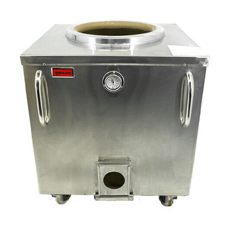 The Omcan 47442 (CE-IN-34X34-C) Tandoor Clay Oven Charcoal is a versatile cooking appliance designed for professional kitchens and culinary enthusiasts alike, measuring 34"W x 34"D x 36"H. This unit incorporates a handcrafted clay pot, delivering authentic taste and cooking efficiency. The package includes extra clay for pot maintenance, liquid oil for seasoning, a gaddi for bread placement, skewers for versatile grilling, and repair cement for durability. Encased in a stainless steel outer box, this tandoor oven ensures longevity and resistance to wear. The addition of 6" casters allows for easy mobility, making it a practical choice for dynamic kitchen environments. Shipped on a pallet, the Omcan 47442 tandoor oven is equipped for traditional charcoal use, catering to diverse culinary demands from authentic Indian restaurants to fusion cuisine establishments. Its robust construction and comprehensive accessory set make it a valuable asset in any professional setting, supporting both high-volume operations and artisanal cooking techniques.