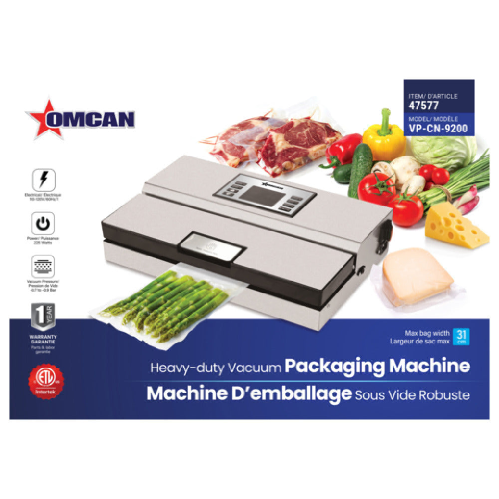 The Omcan 47577 (VP-CN-9200) Vacuum Packing Machine is engineered for precision and efficiency, featuring a 12.2-inch seal bar that ensures a secure and airtight closure. This machine is powered by a 225-watt motor and operates on 110-120V/60Hz with a single-phase power supply, making it suitable for various professional kitchen environments. Its pulse-vac and manual control functions provide flexibility in vacuum packing, catering to the specific needs of different food products. The addition of a canister function further enhances its versatility, allowing users to vacuum-seal not only bags but also vacuum canisters, ideal for preserving delicate items. Certified by cETLus, this machine meets stringent safety and quality standards, offering assurance to commercial users. The Omcan 47577 is a well-suited investment for restaurants, catering services, and food processing units, aiming to extend the shelf life of perishable goods while maintaining their freshness and quality. Its robust construction and reliable performance make it a valuable tool in the foodservice industry, where consistent results and efficiency are paramount.
