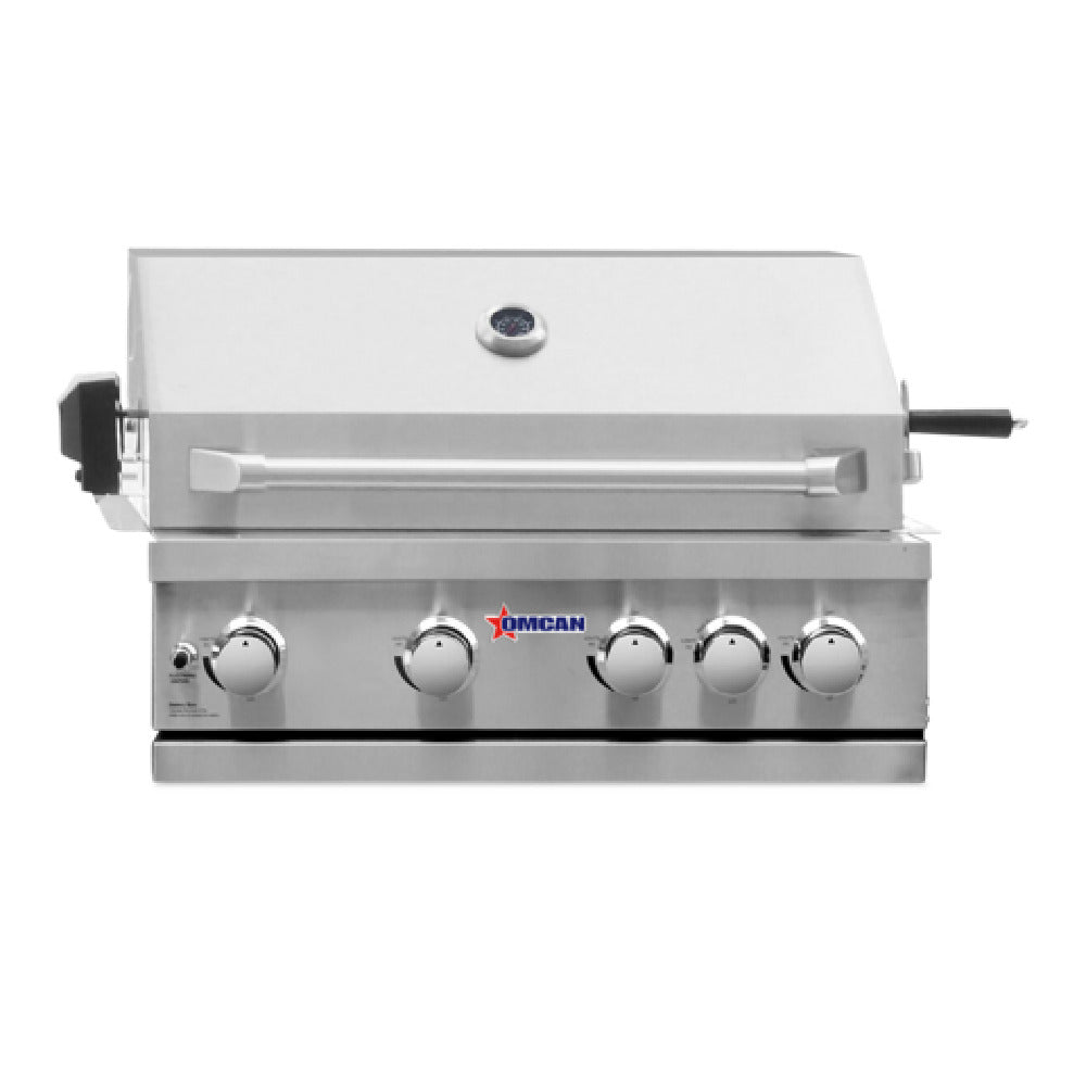 The Omcan 47876 (CE-CN-0030-B LP) Outdoor Propane BBQ Grill is a high-performance LP gas grill designed for serious outdoor cooking enthusiasts and professionals alike. Measuring 30 inches wide, 23 inches deep, and 20 inches high, this grill encompasses four powerful 12,000 BTU tube burners and a 10,000 BTU rear infrared grill burner, culminating in a total output of 58,000 BTU. It features five control knobs enhanced with blue LED lighting, offering precise control over cooking temperatures even during evening cookouts. The grill also includes two built-in halogen lamps to illuminate the cooking surface, ensuring optimal visibility in low-light conditions. A convenient warming rack is integrated for keeping cooked food at serving temperature, while a rotisserie kit offers additional cooking versatility for roasting meats to perfection. Constructed with durable stainless steel, this outdoor grill not only ensures longevity but also provides a sleek, modern aesthetic. Certified by cCSAus, it meets stringent safety and performance standards. The Omcan 47876 is engineered to cater to a diverse range of market segments, from residential users seeking reliable outdoor cooking equipment to professional chefs and caterers requiring efficient and high-output grilling solutions.