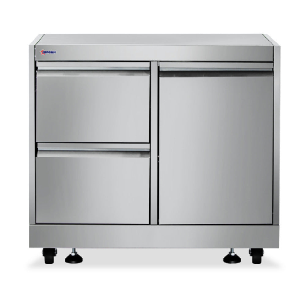 Omcan 47877 (47877) Cabinet Stand For #47876 BBQ Grill 32"W is a versatile and robust unit designed to complement the #47876 BBQ grill, providing both functionality and style. This cabinet stand boasts a solid stainless steel construction, ensuring long-lasting durability and a sleek, modern appearance that fits seamlessly into any outdoor cooking space. With dimensions of 32 inches in width, it features two spacious drawers equipped with soft hinge drawer slides, offering smooth and easy access to stored items, perfect for organizing grilling tools and accessories. Additionally, the cabinet includes a dedicated gas tank compartment and an integrated gas tank tray, which facilitate safe and convenient storage of fuel tanks. The stand is highly mobile, thanks to its four 3-inch casters, two of which are fitted with brakes for secure positioning. For added stability on uneven surfaces, the unit also comes with two adjustable legs, providing flexibility in various outdoor environments. Certified by cCSAus, this cabinet stand meets rigorous safety and quality standards, making it a reliable choice for both casual and professional grill enthusiasts looking to enhance their outdoor cooking setup with a blend of functionality and aesthetic appeal.