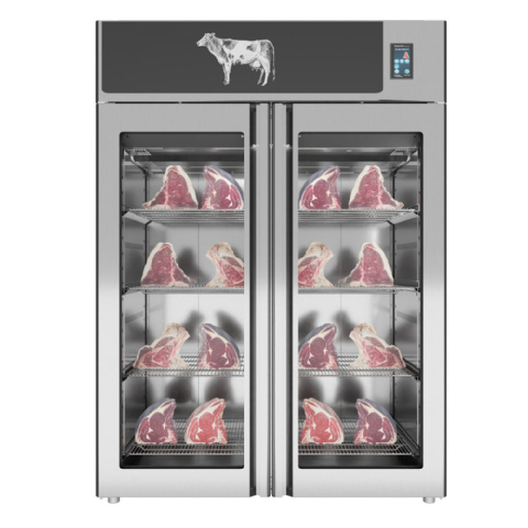 Omcan USA, 48043, (MM-IT-1400-TW) Stagionello® Dry Age 3.0 Cabinet, with Umiright® humidity management, 49.5 cu. ft. capacity, 26.6°F (-3°C) to 95°F (35°C) temperature range, (2) hinged glass doors, (8) 77 lb. capacity shelves, 4.3" touch screen display with smart icon, pH reading, monitoring & alarms, (10) climatic recipes, (2) HACCP systems, 304 stainless steel interior, 980 watts, 220-240v/60/1-ph, 13.4 amps, QPS, Made in Italy