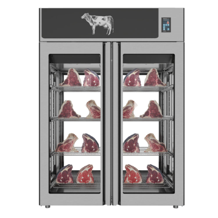 Omcan USA, 48045, (MM-IT-1400-TWAV) Stagionello® Dry Age 3.0 Cabinet, with Umiright® humidity management, 49.5 cu. ft. capacity, 26.6°F (-3°C) to 95°F (35°C) temperature range, (2) hinged glass doors, glass back & sides, (8) 77 lb. capacity shelves, 4.3" touch screen display with smart icon, pH reading, monitoring & alarms, (10) climatic recipes, (2) HACCP systems, 304 stainless steel interior, 980 watts, 220-240v/60/1-ph, 13.4 amps, QPS, Made in Italy