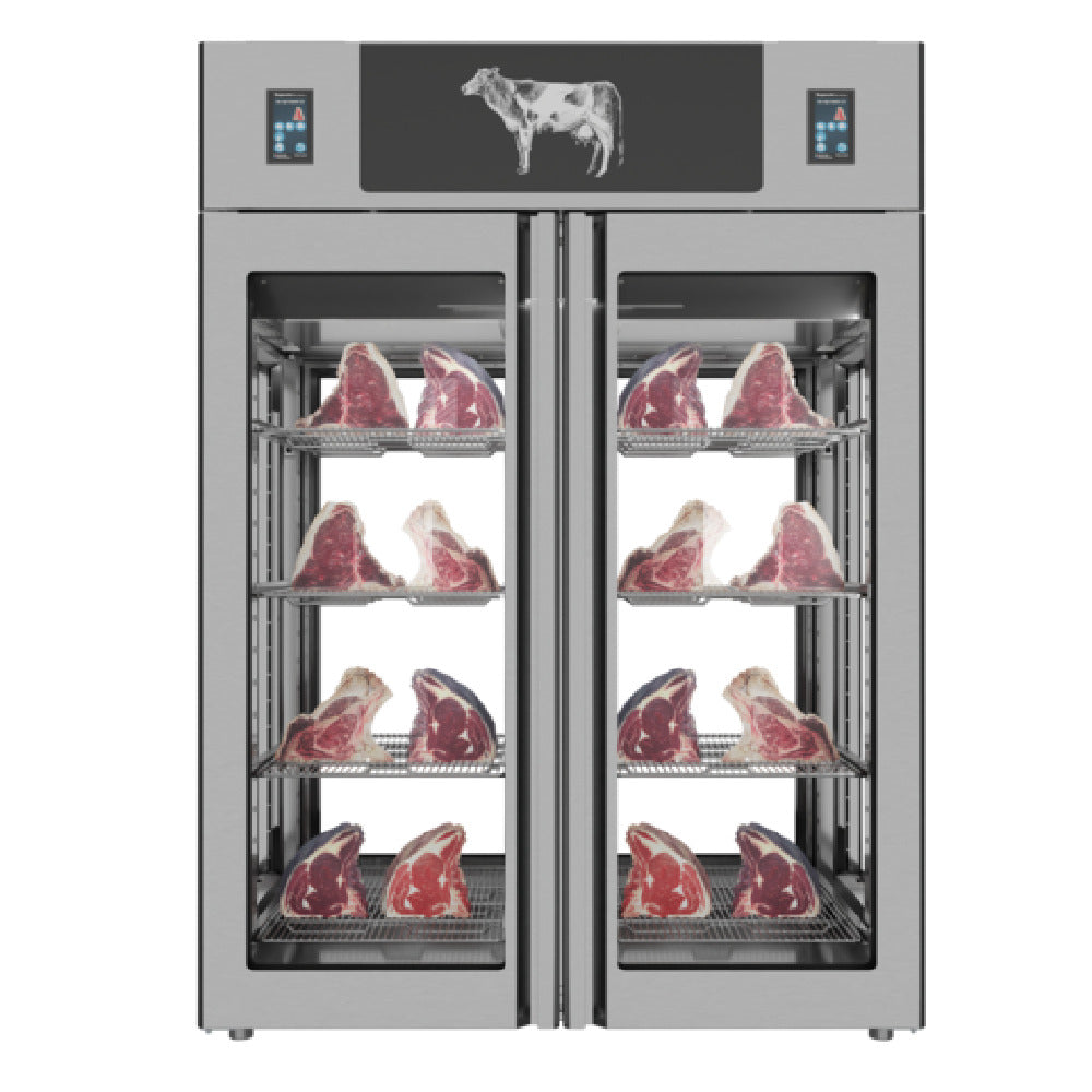 Omcan USA, 48048, (MM-IT-1400-TWCAV) Stagionello® Dry Age 3.0 Twin Cabinet, two-section, with Umiright® humidity management, 49.5 cu. ft. capacity, 26.6°F (-3°C) to 95°F (35°C) temperature range, (2) hinged glass doors, glass back & sides, (8) 77 lb. capacity shelves, 4.3" touch screen display with smart icon, pH reading, monitoring & alarms, (10) climatic recipes, (2) HACCP systems, 304 stainless steel interior, 1300 watts, 220-240v/60/1-ph, 15 amps, QPS, Made in Italy