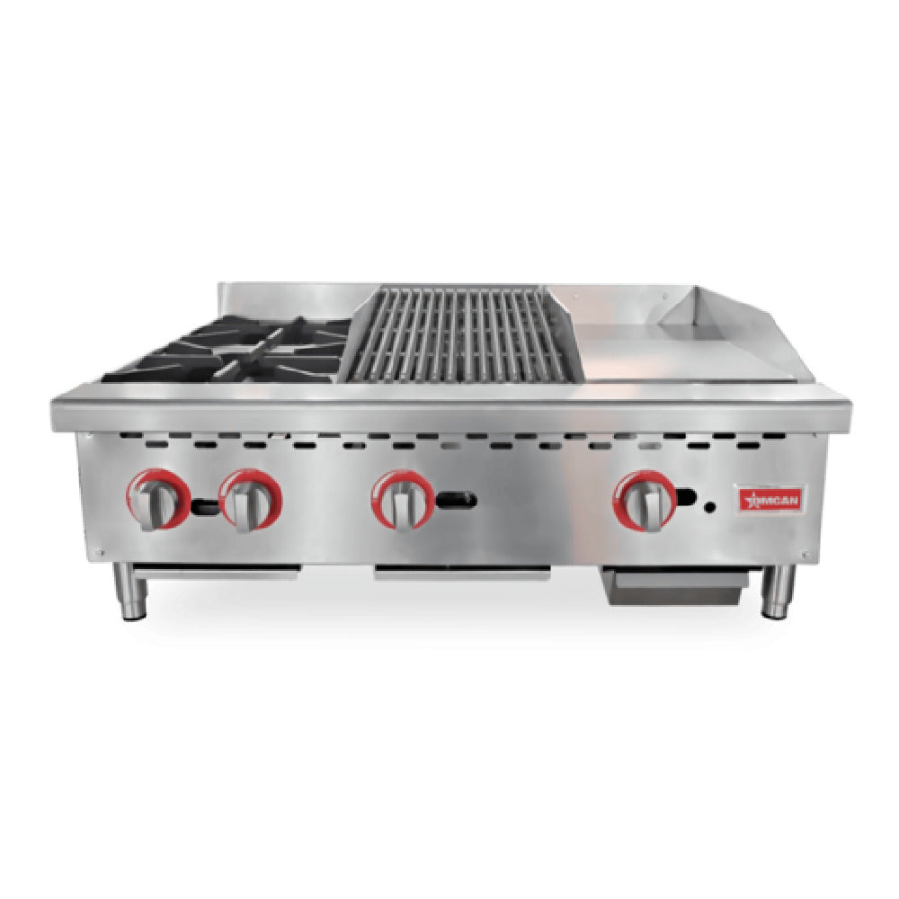 Omcan USA, 48086, (CE-CN-12H12C12G) Hotplate/Griddle/Char-Broiler Combination, countertop, natural gas, 36" wide x 28-4/5" deep frame, (2) 25,000 BTU burners, (1) 12" x 20-3/5" griddle plate, (1) 12" x 20-3/5" charbroil surface, standing pilot ignition system, adjustable front pilot light, stainless steel front edge, adjustable stainless steel non-skid feet, (4) manual controls, 115,000 BTU, cCSAus, CSA-Sanitation, CSA Flame, CSA Star