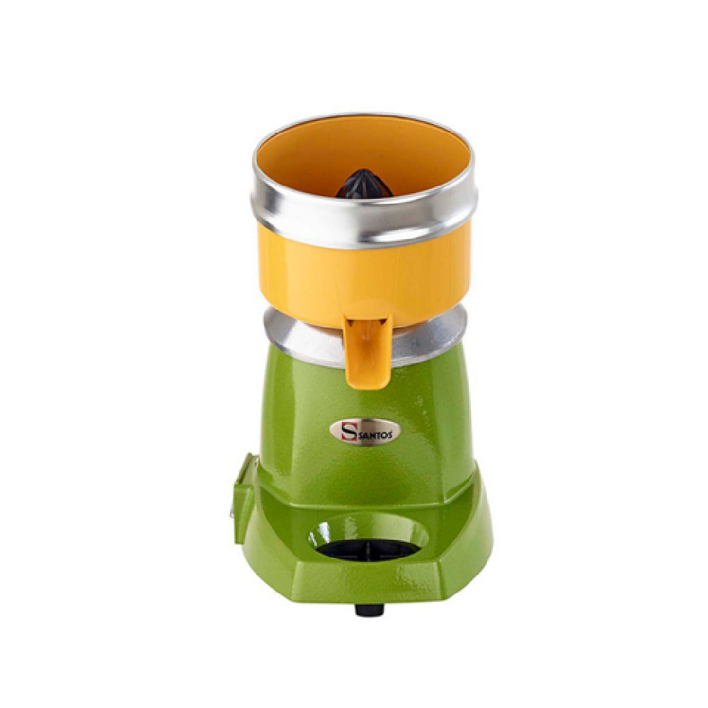 The Omcan 48110 (SANTOS 11) Santos® Citrus Juicer With Lever - 32 Quarts/hr is a superior choice for efficient citrus juice extraction, positioned well for various market segments including commercial kitchens and juice bars. With an impressive extraction rate of 32 quarts per hour, this juicer supports high-demand environments. It features an automatic pulp ejection system, allowing for continuous operation without manual intervention. The unit boasts a silent motor operating at 1800 rpm, and a power output of 0.35 HP, ensuring efficient and quiet performance. Constructed with a durable stainless steel and aluminum body, it offers longevity and robustness, paired with an attractive green finish that complements any professional setting. The Omcan 48110 is equipped with a lever mechanism, simplifying the juicing process and enhancing user convenience. Operating on 120 volts with a NEMA 5-15P plug, it is designed to meet CE, RoHS, and NSF standards, highlighting its compliance with safety and environmental regulations. Handcrafted in France, this juicer combines artisanal quality with advanced technology, making it a reliable and stylish addition to any juice production setting.