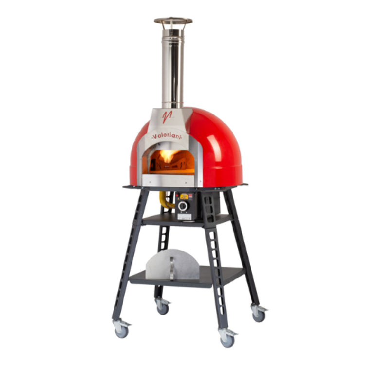 The Omcan 48144 (PE-IT-0060-RM) Trento Valoriani Baby 60 Gas Oven - Natural Gas is a sophisticated piece of culinary equipment specifically designed to meet the rigorous demands of the food industry. With an inside cooking surface measuring 23-3/5" x 13", this oven is perfectly suited for establishments looking to efficiently produce high-quality dishes. Capable of accommodating one 11"-12" pizza at a time, it features a refractory Cotto clay stone bakery floor, which is renowned for its heat retention and distribution properties, ensuring a consistently excellent bake. The unit incorporates a 6" diameter flue, integral for effective ventilation and temperature control. Additional components include a complete stand tube, a rain cap for weather protection, and a convenient shelf. The aesthetically pleasing red metal dome and stainless steel arch add a touch of elegance, while the unit's certifications, cETLus and ETL-Sanitation, attest to its compliance with North American safety and sanitation standards. Proudly made in Italy, the Omcan Trento Valoriani Baby 60 Gas Oven is a valuable asset for any food service business looking to enhance its culinary offerings with reliable, high-quality equipment.