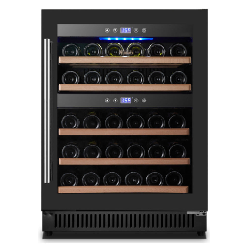The Omcan 48260 (WC-CN-0040-DB) Vinovero Wine Refrigerator One-section 23"W is an advanced refrigeration unit designed to cater to the precise needs of wine enthusiasts and professionals alike. This self-contained unit measures 23 inches wide and features two independent temperature zones, allowing for optimal storage conditions for different wine varieties. The wine refrigerator accommodates up to 40 bottles, maintaining temperatures between 37.4°F and 71.6°F, thus providing flexible chilling options. It is equipped with interior LED lighting and a digital control display, enhancing user experience and operational convenience. The tinted glass door adds a touch of elegance while protecting the wine from harmful UV rays. Inside, the sliding beech wood shelves offer both aesthetic appeal and functional storage. Powered by R600a refrigerant and operating at 121 watts with a 110-120v/60/1-ph electrical requirement, this refrigerator is efficient and environmentally friendly. The unit's black exterior gives it a sleek, modern look, and it is shipped on a pallet, ensuring safe delivery. This model is ideal for residential settings, wine bars, and retail environments, providing a versatile solution for wine storage with an emphasis on quality and reliability. The Omcan 48260 represents a harmonious blend of technology and design.