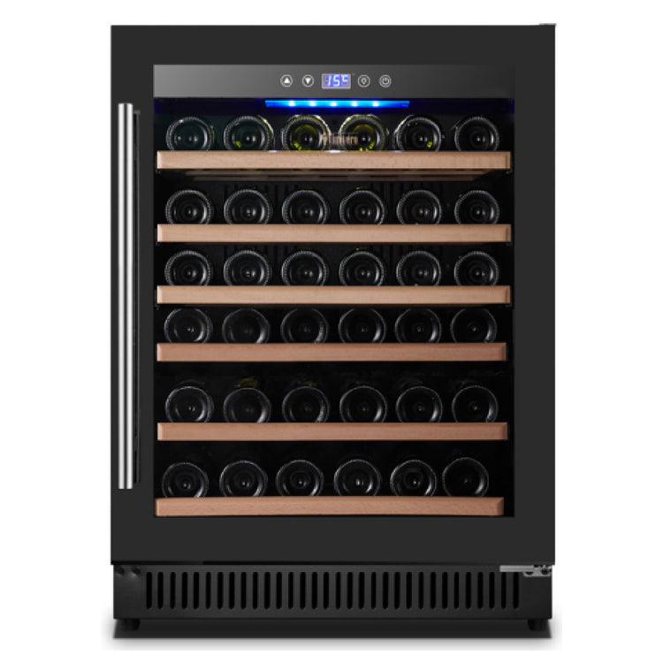 The Omcan 48261 (WC-CN-0051-SB) Vinovero Wine Refrigerator is a premium appliance designed for wine enthusiasts and commercial establishments, offering a seamless blend of style and functionality. With a compact 23-inch width, this one-section unit is perfect for both home connoisseurs and small-scale hospitality venues. It features a self-contained, single-zone cooling system with a wide temperature range of 37.4°F-71.6°F, ensuring optimal storage conditions for various wine types. The refrigerator has a generous capacity of 51 bottles, making it a versatile choice for smaller collections. Its interior is illuminated by energy-efficient LED lighting, enhancing visibility while preserving bottle integrity. The digital control and display provide precise temperature regulation, vital for maintaining wine quality over time. The tinted glass door not only adds an elegant touch but also protects the wine from harmful UV rays. Inside, sliding beech wood shelves offer durability and easy access to your collection. Operating with R600a refrigerant, this refrigerator is environmentally friendly and energy-efficient, consuming just 121 watts. Designed with a sleek black exterior, the unit is powered by a 110-120v/60/1-ph electrical setup and is equipped with a NEMA 5-15P plug, ensuring compatibility and ease of installation. Shipped on a pallet, it is ready for immediate setup.