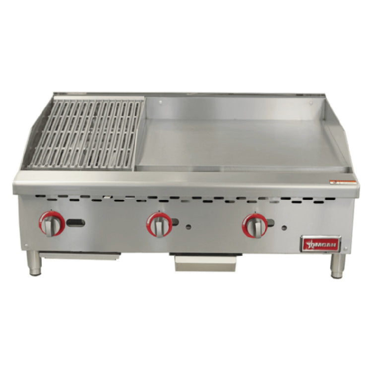 Omcan USA, 48296, (CE-CN-12C24G) Griddle/Char-Broiler Combination, countertop, natural gas, 36" wide x 29" deep frame, (1) 24" x 20-3/5" griddle plate, (1) 12" x 20-3/5" charbroil surface, standing pilot ignition system, adjustable front pilot light, stainless steel front edge, adjustable stainless steel non-skid feet, (3) manual controls, 95,000 BTU, cCSAus, CSA-Sanitation, CSA Flame, CSA Star