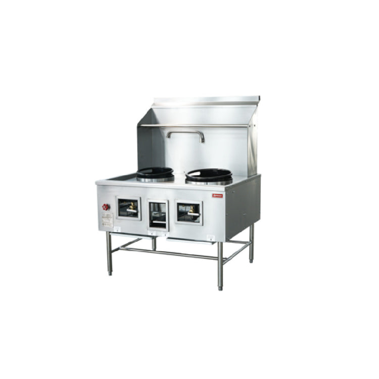 Omcan USA, 48413, (CE-CN-W2L1-NG) Wok Range, natural gas, (2) chambers, 47-1/2"W x 44"D x 62"H, (1) 13" wok ring & (1) 16" wok ring, (2) jet burners, adjustable knee "L" lever gas valve handles, pilot ignition, stainless steel faucet, backsplash & pipe rack, water cooled top, 220,000 BTU, cETLus, ETL-Sanitation