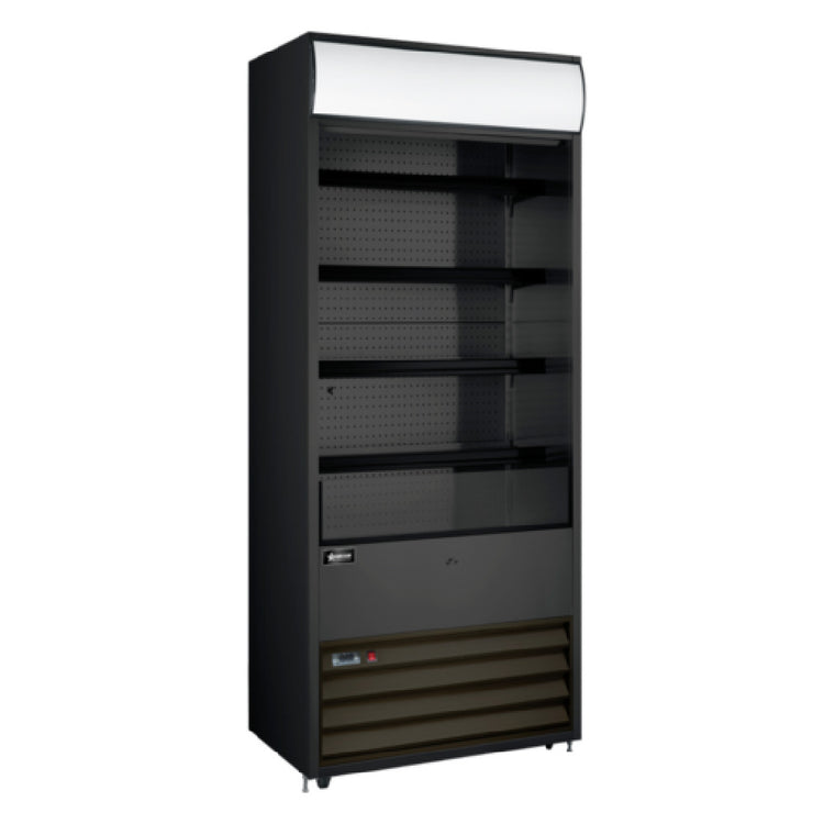 Omcan USA, 48480, (RS-CN-0440-B) Grab-and-Go Refrigerated Showcase, open, 30"W, 15.53 cu.ft. (440 L) capacity, 35.6° to 50°F temperature range, digital temperature controller & display, LED interior lighting, (5) adjustable shelves, automatic defrost, pull-down night curtain, self-contained refrigeration, (4) casters (2 with brakes), R290 Hydrocarbon refrigerant, black, 1700 watts, 110v/60/1-ph, NEMA 6-15P, cETLus, ETL-Sanitation