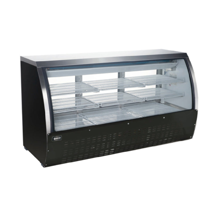 The Omcan 50083 (RS-CN-0163-B) Refrigerated Deli Display Case Floor Model 64"W is an innovative refrigeration solution tailored for commercial use, especially in delicatessens and retail environments. With a substantial capacity of 620 liters (21.9 cubic feet), this display case accommodates a wide assortment of products, ensuring they are preserved at optimal freshness. The bottom-mount self-contained refrigeration system, utilizing R290 Hydrocarbon refrigerant, efficiently maintains temperatures between 32°F and 43°F (0°C - 6°C). It is equipped with a gravity coil refrigeration system and features a robust 3/5 horsepower motor, operating on a 115v/60/1-ph power supply with a 7.14 amp draw. Designed with functionality in mind, the case includes six adjustable PVC-coated shelves and a removable installation board for adaptable display configurations. Its sleek curved glass front, paired with rear sliding glass doors, enhances product visibility while maintaining easy access. The unit's interior is lined with aluminum and features a stainless-steel floor, complemented by a black-coated steel exterior, offering durability and aesthetic appeal. With LED interior lighting and a rounded corner design, this display case not only highlights merchandise attractively but also ensures safety and accessibility. Certified by cETLus and ETL-Sanitation, the Omcan 50083 stands as a reliable and efficient choice in refrigerated display solutions.