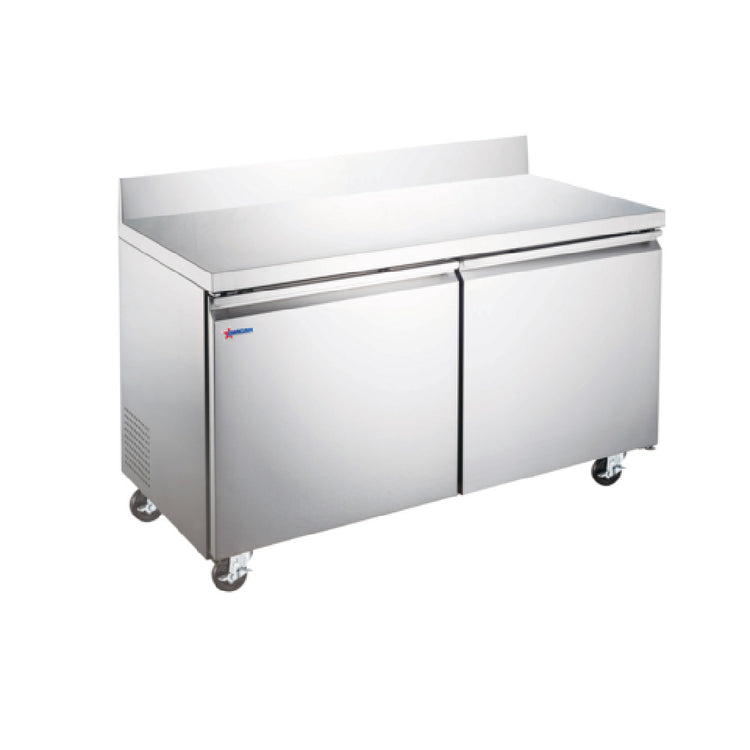 The Omcan 50097 (RE-CN-0011-BS-HC) Worktop Refrigerator is a versatile two-section unit with a width of 47 inches, designed to meet the refrigeration needs of professional kitchen environments. It boasts a substantial 11 cubic feet capacity to accommodate a variety of perishable items. This refrigerator features two solid doors and is equipped with two adjustable shelves, allowing users to customize the interior layout to suit different storage requirements. The digital control system provides precise temperature management, while the automatic defrost function ensures optimal efficiency and ease of maintenance. The 3-1/2 inch backsplash is a practical addition that helps maintain cleanliness in busy kitchen settings. Constructed with a durable stainless steel interior and exterior, this refrigerator is built to withstand the demands of commercial use. Its rear-mounted self-contained refrigeration system utilizes R290 Hydrocarbon refrigerant, aligning with eco-friendly standards. Operating at 115 volts, 60 Hz, and 2.4 amps, the unit is designed for efficiency and reliability, with a NEMA 5-15P plug configuration. Certified by cETLus and ETL-Sanitation, the Omcan 50097 stands as a reliable choice for foodservice professionals who require robust refrigeration solutions with a focus on sustainability and performance.