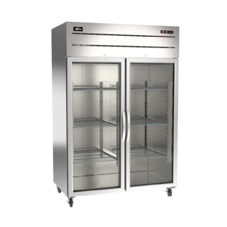 Omcan USA, 50119, (RE-CN-0054G-TM) Refrigerator, reach in, two-section, 43.1 cu. ft., top mount self-contained refrigeration, 33°F to 40°F (0.5°C to 4.4°C) temperature range, digital temperature controller, (2) hinged glass doors, (6) adjustable plastic coated shelves, LED interior lighting, automatic defrost, stainless steel interior & exterior, casters, R290 Hydrocarbon refrigerant, 115v/60/1-ph, 4.2 amps, cETLus, ETL-Sanitation, ENERGY STAR® (shipped on pallet)
