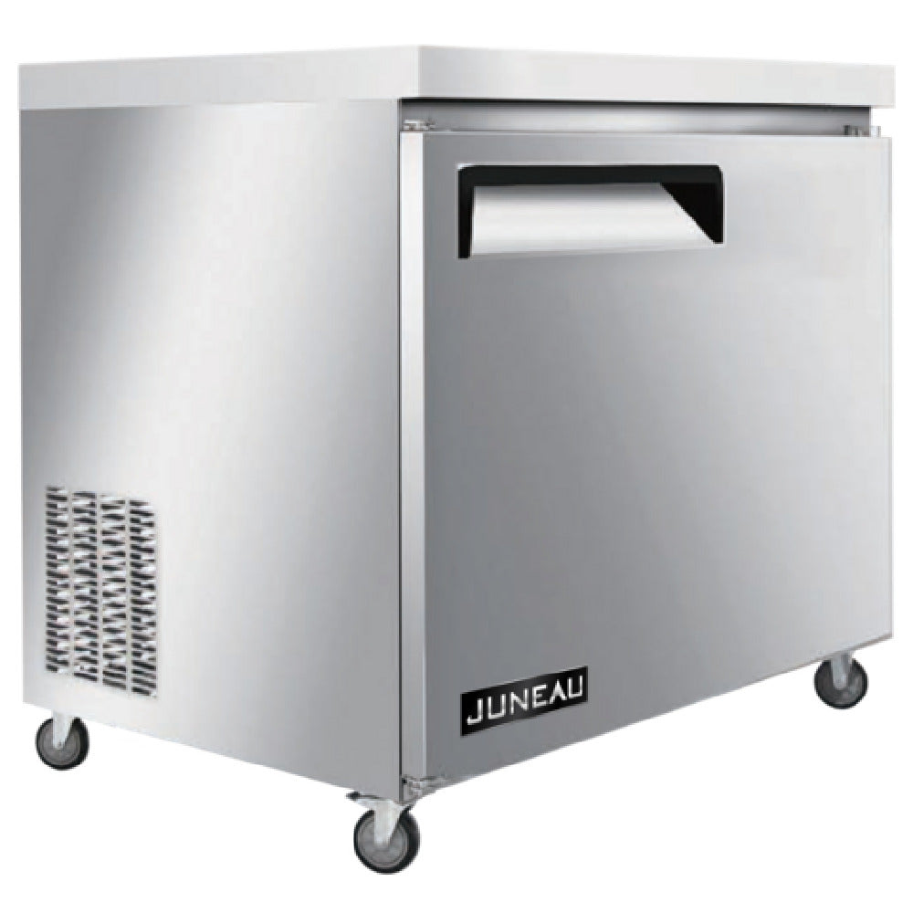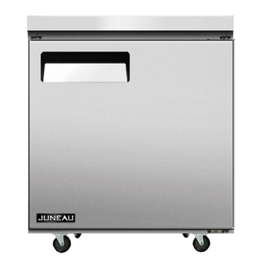 The Omcan 58011 (FR-TH-0686-HC) Juneau Undercounter Freezer Reach In One-section is a compact, efficient cooling solution designed for various industry settings requiring precise temperature management. Measuring 27 inches in width, this freezer offers a storage capacity of 3.4 cubic feet, making it suitable for spaces where both performance and compactness are essential. It features a bottom-mount self-contained refrigeration system with a temperature range of -8°F to 0°F (-22°C to 18°C), ensuring optimal cooling conditions for perishable goods. Equipped with a solid hinged door and adjustable shelves, it provides both accessibility and storage flexibility. The freezer uses a digital temperature controller for precise temperature regulation, enhancing its reliability in maintaining its cooling environment. Constructed with a stainless steel interior and exterior, the unit promises durability and ease of cleaning. Mobility and stability are ensured with four casters, two of which have brakes. Utilizing R290 Hydrocarbon refrigerant, this freezer is energy-efficient and eco-friendly. Operating at 780 watts on a 115v/60/1-ph power supply, the Omcan 58011 complies with cETLus and ETL-Sanitation standards, making it a trusted choice for commercial kitchens, convenience stores, and other food service establishments seeking dependable undercounter freezing solutions.