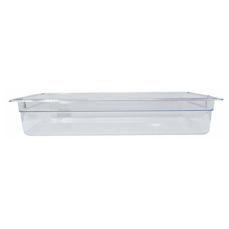 The Omcan 80058 (80058) Food Pan is a full-size kitchen essential with precise dimensions of 20-3/4 inches in length, 12-4/5 inches in width, and 3-15/16 inches in depth. Constructed from clear polycarbonate, this food pan offers durability and strength while allowing easy visibility of contents. It is NSF-certified, ensuring it meets stringent public health and safety standards, making it a reliable choice for professional kitchens. This food pan is versatile and suitable for various industry segments, including restaurants, catering services, and food preparation establishments that demand reliable and hygienic food storage solutions. The clear polycarbonate construction not only provides excellent resistance to impact and temperature changes but also ensures that the pan remains lightweight and easy to handle. The Omcan 80058 Food Pan's design facilitates efficient organization and storage of ingredients, enhancing operational efficiency in busy kitchen environments. Its standardized full-size dimensions make it compatible with an array of kitchen equipment and storage systems, providing seamless integration into existing workflows. This food pan is an indispensable tool for culinary professionals, delivering consistent performance and reliability in any food service operation.