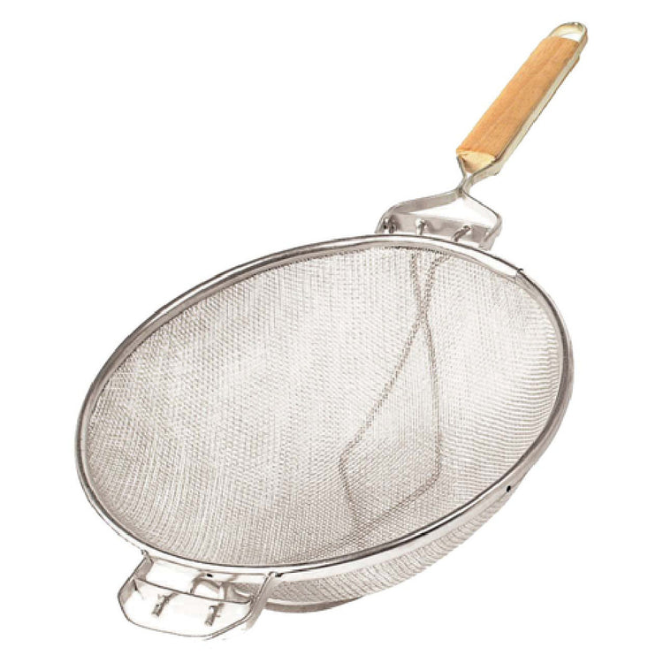 The Omcan 80366 (80366) Strainer 10" Diameter Reinforced Tinned Double Mesh is an essential kitchen tool designed for both everyday cooking and professional culinary environments. With a substantial diameter of 10 inches, this strainer provides ample surface area for efficient straining of a variety of ingredients, catering to diverse culinary needs. Its reinforced tinned double mesh construction delivers enhanced durability and stability, ensuring long-lasting performance even under frequent use. The double mesh design is specifically engineered to provide superior filtration, effectively capturing fine particles while allowing liquids to pass through smoothly. This strainer features a flat wood handle, offering a comfortable grip and reducing heat transfer during use, making it user-friendly and practical for high-heat applications. The Omcan 80366 strainer is particularly valuable in segments such as restaurants, caterers, and home kitchens, where its robust build and reliable performance can improve operational efficiency. By combining functional design with sturdy materials, this strainer meets the demands of various market segments within the foodservice industry, establishing itself as a versatile and indispensable kitchen accessory.