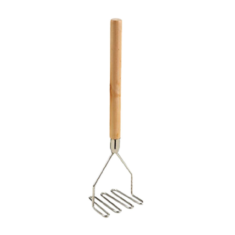 The Omcan 80397 (80397) Potato Masher stands out as a versatile tool essential for any kitchen setting, combining durability with functionality. Featuring a square-shaped masher head that measures 5-1/4 inches, this product ensures easy and efficient mashing of potatoes, making it an indispensable item for both home cooks and professional chefs. Crafted with a nickel-plated surface, the masher boasts enhanced resistance to corrosion, ensuring longevity and reliability over time. Complementing this robust design is a 24-inch chrome-plated wood handle, offering a comfortable grip and excellent reach, allowing users to mash potatoes without straining their hands or wrists. The chrome plating not only adds a layer of durability but also offers an appealing aesthetic, making it a stylish addition to any kitchenware collection. This potato masher caters to a diverse market segment, from commercial kitchens seeking reliable equipment to home kitchens valuing high-quality tools. Its sturdy construction and thoughtful design make the Omcan 80397 (80397) Potato Masher a practical choice for any culinary enthusiast looking to achieve perfectly mashed potatoes with ease and efficiency.