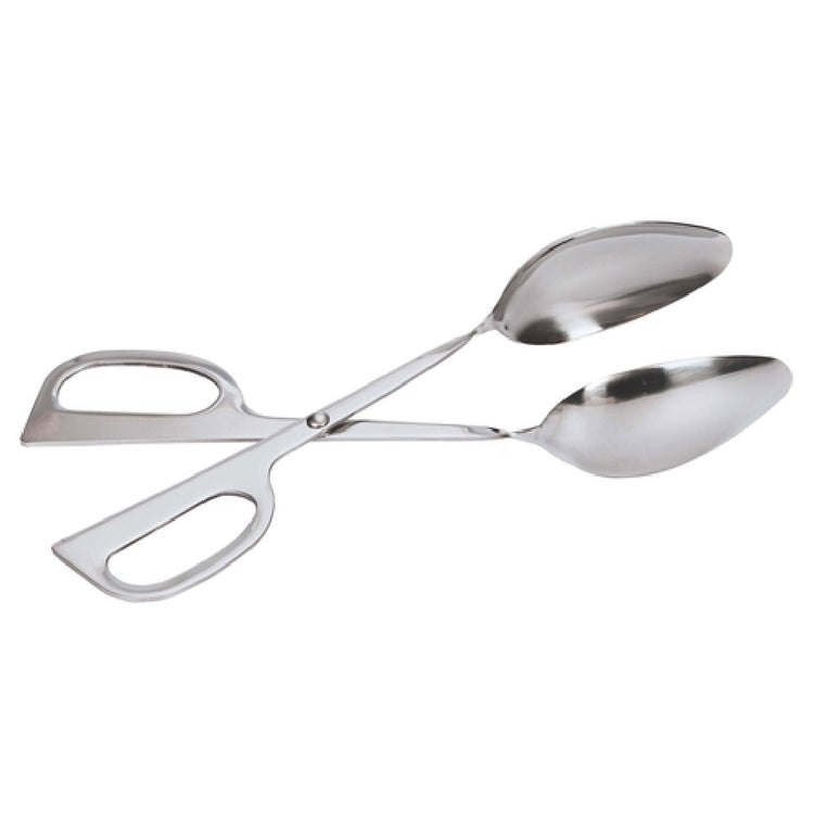 Omcan 80425 (80425) Salad Scissor Tongs 10" O.A. Double Spoons - These salad scissor tongs feature a unique dual-spoon design, crafted from durable stainless steel, making them ideal for both commercial and home kitchen use. The 10-inch overall (O.A.) length is perfectly balanced for ease of use, allowing for a comfortable grip and precise control when serving salads or similar dishes. The double spoon configuration facilitates efficient serving, eliminating the need for multiple utensils, enhancing convenience for users. Constructed from stainless steel, these tongs offer robust resistance to rust and corrosion, ensuring longevity even in high-volume settings such as restaurants and catering services. This makes them particularly valuable for food service professionals seeking reliable tools that maintain their quality over time. The Omcan 80425 Salad Scissor Tongs also stand out for their ease of cleaning, a crucial factor in maintaining hygiene standards in any food preparation environment. These features converge to make the Omcan 80425 an essential tool for chefs and culinary enthusiasts alike, who value durability, efficiency, and practicality in their kitchen implements.