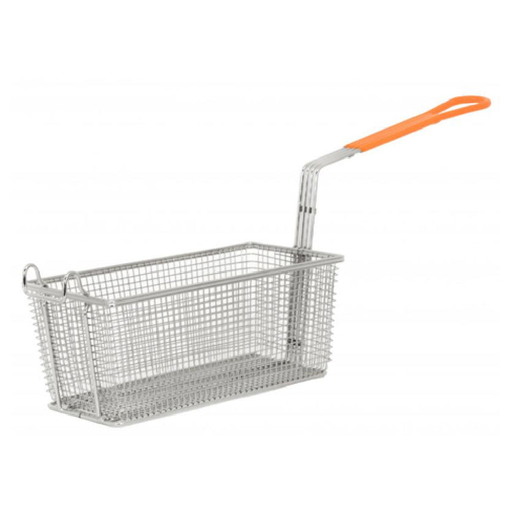 The Omcan 80554 (80554) Fryer Basket is a precision-engineered kitchen accessory designed to enhance frying efficiency across various culinary environments. Measuring 12-1/8 inches in depth, 6-5/16 inches in width, and 5-5/16 inches in height, this fryer basket is engineered to fit a range of commercial fryers, ensuring versatility and adaptability within the foodservice industry. Its construction features nickel-plated iron, offering durability and resistance to corrosion, which is particularly beneficial in high-volume cooking settings. The basket is equipped with a heat-resistant plastic handle in a distinctive orange color, designed to provide safety and comfort during handling, reducing the risk of burns and enhancing operational safety. Furthermore, the inclusion of a hanging hook facilitates easy storage and accessibility, optimizing kitchen organization and workflow. The Omcan 80554 Fryer Basket is a vital tool for restaurants, catering services, and any establishment that demands reliable and efficient frying solutions. Its robust design and practical features cater to the needs of culinary professionals seeking durable and high-performing frying equipment.