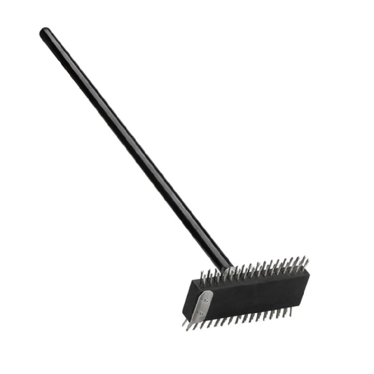The Omcan 80947 (80947) Pizza Oven Brush is an expertly designed tool essential for maintaining the cleanliness and efficiency of pizza ovens in both commercial and residential settings. This versatile cleaning instrument features a double-sided brush, providing a comprehensive solution for eliminating debris and buildup within the oven. The inclusion of a side metal scraper enhances its functionality, allowing for the effective removal of stubborn, baked-on residue. The brush is equipped with a black handle, offering a comfortable grip and ensuring ease of use during operation. These features collectively underscore the Omcan 80947 Pizza Oven Brush's utility in ensuring optimal oven performance and longevity. This product's dual-action design makes it ideal for pizzerias and restaurants that require durable and efficient cleaning tools. By maintaining the cleanliness of the oven, this brush contributes to consistent cooking results and high-quality pizza production. Its sturdy construction ensures it withstands frequent use in high-demand environments, making it a valuable asset for any segment of the food service industry that prioritizes hygiene and efficiency.