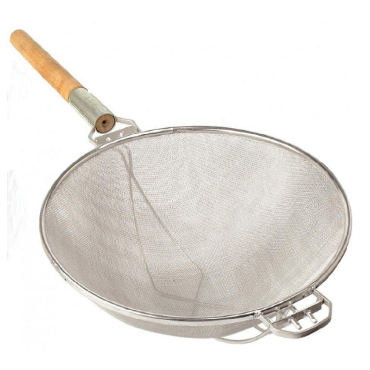 The Omcan 81003 (81003) Strainer - 10-1/2" Diameter Reinforced Stainless Steel Double Mesh is a high-quality kitchen tool designed for efficiency and durability. With a round wood handle, this strainer provides a comfortable grip, making it ideal for prolonged use in both home and professional kitchens. The reinforced stainless steel construction ensures long-lasting performance, resisting corrosion and maintaining its structural integrity even under frequent use. The double mesh design effectively filters out finer particles, making it suitable for straining sauces, soups, and other culinary preparations where clarity is crucial. The 10-1/2 inch diameter offers ample space for processing large quantities at once, enhancing productivity in busy kitchen environments. The Omcan 81003 strainer is versatile and can be utilized in various culinary applications, making it a valuable asset for chefs and culinary enthusiasts looking for reliable kitchen tools. Its robust build and thoughtful design cater to the needs of different segments within the food industry, from small restaurants to large commercial kitchens, providing an indispensable solution for precise straining tasks. This product stands out for its blend of durability, functionality, and convenience, making it a top choice for effective kitchen operations.