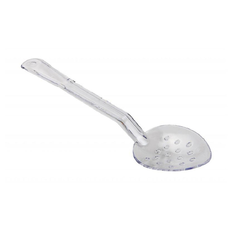 The Omcan 85092 (85092) Serving Spoon 11" Long Perforated is a versatile and essential utensil for professional kitchens and catering services. Crafted from high-quality polycarbonate, this serving spoon is both durable and lightweight, ensuring ease of use during food preparation and serving. Its 11-inch length provides ample reach for serving a variety of dishes, while the perforated design allows for efficient draining of liquids, making it particularly useful for serving wet or saucy foods without excess liquid transfer. The clear construction not only offers a sleek and modern aesthetic but also allows for easy monitoring of food residue, ensuring hygiene and cleanliness. As an NSF-certified product, this serving spoon meets rigorous public health and safety standards, making it suitable for use in both commercial and home kitchens. Its construction from polycarbonate also means it is resistant to breaking and chipping, providing long-lasting use. The Omcan 85092 Serving Spoon's combination of practicality, durability, and safety certification makes it a valuable tool in any food service operation, catering to the needs of chefs, caterers, and hospitality professionals who require reliable and efficient serving utensils.