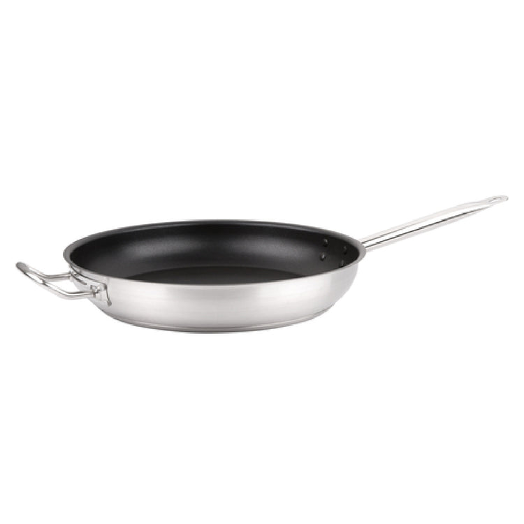 The Omcan 85275 Fry Pan is a high-quality cooking instrument designed for culinary professionals and home chefs alike. With a substantial 14-inch diameter, this fry pan is crafted from 443 stainless steel, known for its durability and resistance to corrosion, ensuring longevity and reliable performance in high-demand kitchens. The pan features a riveted handle that provides a secure and stable grip, along with a helper handle that aids in maneuverability, especially when handling larger quantities of food. The brazing bottom enhances heat distribution, allowing for even cooking results. Furthermore, the Excalibur non-stick coating offers superior food release, simplifying the cooking and cleaning process. This fry pan is NSF certified, meeting strict public health and safety standards, making it a trusted choice for commercial and residential use. Its design and functionality cater to a wide range of cooking environments, from bustling restaurant kitchens to gourmet home setups, emphasizing its adaptability across different segment markets within the culinary industry.