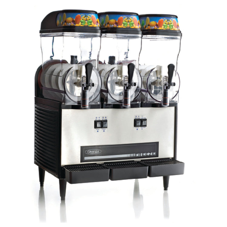 The Omega OFS30 Omega Granita Machine Lighted Top Panel (3) 3 Gallon Clear Polycarbonate Container is an advanced solution for beverage service, offering a blend of durability and functionality. Designed with three 3-gallon clear polycarbonate containers, it provides ample capacity for serving a variety of frozen beverages, making it suitable for high-demand environments such as cafes, bars, and event venues. The continuous agitator ensures consistent texture and quality of the granita, while the removable drip tray enhances ease of cleaning and maintenance. Its non-dripping mechanism minimizes waste and keeps the serving area clean. Constructed with a stainless steel cylinder, frame, and front panel, this granita machine is built for long-lasting use and a sleek appearance. The machine operates with a powerful 1/2 HP motor and 980 watts, ensuring efficient performance. Certified by cETLus, it meets rigorous safety and quality standards. The lighted top panel not only adds a visually appealing element but also helps in showcasing the beverages and attracting customers. With its combination of capacity, technical features, and aesthetic design, the Omega OFS30 is a versatile choice for any food service operation looking to enhance its beverage offerings.
