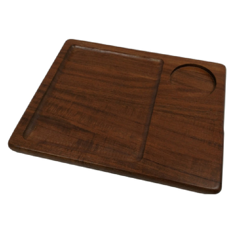 On The Table 116DK Plate Medium 10" x 8" is a meticulously crafted serving piece designed to enhance both residential and commercial dining experiences. This medium-sized, rectangular plate measures 10 inches by 8 inches, providing ample space for a variety of culinary presentations. A distinctive feature of the 116DK is its 2-1/2 inch diameter well, which is perfect for accommodating sauces, dips, or small delicacies. Constructed from dark acacia wood, this plate exudes a natural, sophisticated aesthetic that complements any table setting. Its dark wood tone offers a striking backdrop that enhances the visual appeal of the served dish. The plate is also dishwasher safe, ensuring ease of maintenance and durability, making it suitable for busy restaurant environments or home dining scenarios. On The Table 116DK Plate is an ideal choice for those in the food service industry seeking to combine functionality with elegance, as well as for home users looking to elevate their dining presentation. Its blend of practicality and style makes it a versatile addition to any dining collection, catering to a range of markets from high-end restaurants to casual home gatherings.