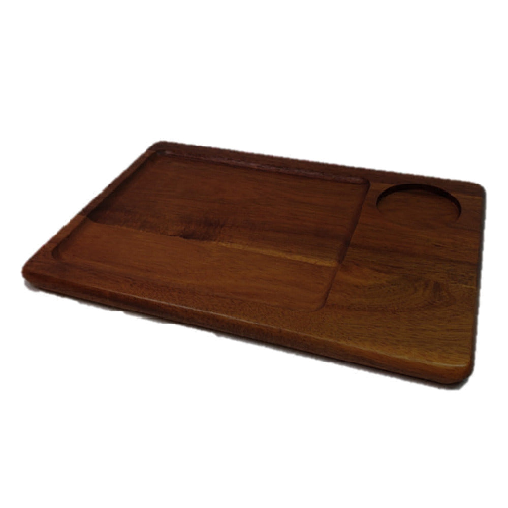 The On The Table 128DK Plate Large 12" X 8" is a meticulously crafted serving piece perfect for various culinary settings. Made from dark acacia wood, this rectangular plate measures 12 inches by 8 inches, providing ample space for a variety of dishes. The inclusion of a 2-1/2-inch diameter well makes it uniquely suited for meals that require sauce containment or for use as a serving platter with a dip section. This feature is particularly beneficial in settings ranging from upscale restaurants to casual dining, where presentation is key. Its natural finish highlights the rich grain of acacia wood, adding an element of rustic elegance to any table setting. Practicality is not compromised, as the plate is dishwasher safe, ensuring ease of maintenance without sacrificing its aesthetic appeal. The On The Table 128DK is ideal for hospitality businesses aiming to enhance their dining experiences with stylish, functional tableware. Its robust construction and versatile design make it an asset for catering, buffets, or even home dining. This plate embodies a perfect balance of form and function, making it a valuable addition to any collection where quality and design are paramount.