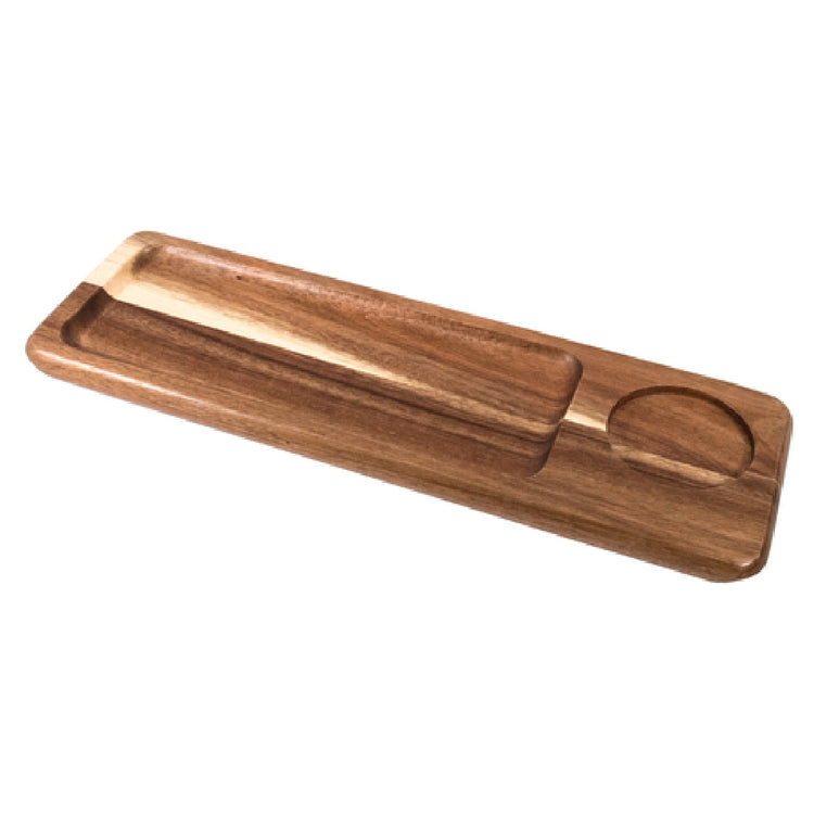 On The Table 129 Appetizer Plate Large 14" x 4-1/2" is a meticulously crafted rectangular serving solution that enhances culinary presentations. This plate is made from natural acacia wood, renowned for its durability and rich, earthy appearance, making it an elegant addition to any dining experience. With dimensions of 14 inches by 4-1/2 inches, it offers ample space to artfully arrange appetizers, tapas, or small bites, catering to the needs of restaurants, catering services, and home entertainers alike. A distinctive feature of this plate is its 2-1/2-inch diameter well, perfect for holding dips, sauces, or garnishes, effectively keeping them separate from dry ingredients. Practicality meets style as the plate is dishwasher safe, ensuring convenience for busy commercial kitchens or lively dinner parties. The On The Table 129 Appetizer Plate Large stands out in the market for its combination of form and functionality, providing a robust platform for culinary creativity. Its natural wood finish complements various table settings and themes, from rustic to modern, making it a versatile choice for professionals in the food service industry and passionate home cooks aiming to elevate their presentation.