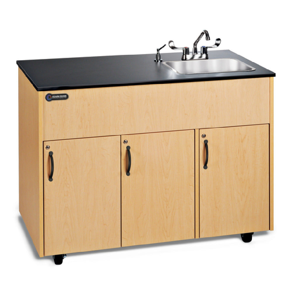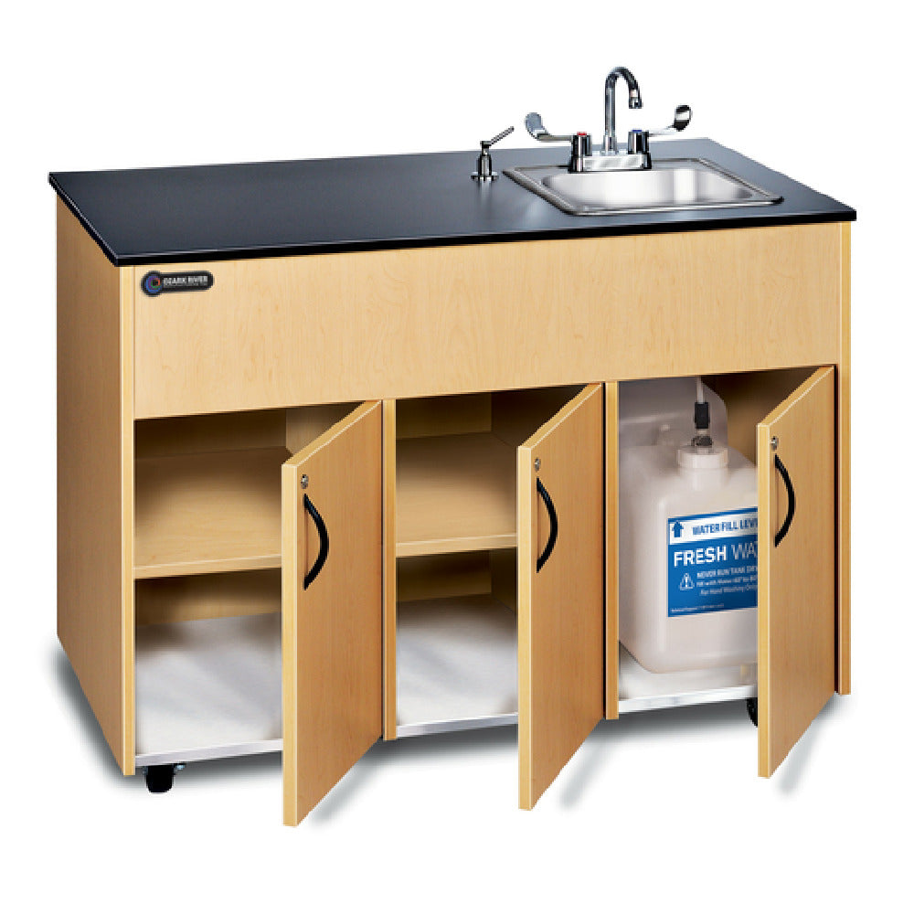 The Ozark River Manufacturing ADAVM-LM-SS1DN Portable Hand Sink Hot Water Self-contained unit integrates functionality and mobility, designed to meet diverse industry needs. This self-contained, NSF-Certified hand sink measures 48-1/4 inches in width, 24-1/4 inches in depth, and 38-1/4 inches in height, making it compact yet spacious for efficient use. Constructed with a durable melamine body and a steel bottom, it is equipped with 5-inch locking casters for easy mobility, ensuring it can be positioned wherever necessary. The laminate top features a sink basin measuring 14 inches wide, 10 inches front-to-back, and 9-5/8 inches deep, supplemented by ADA-Compliant wrist-action handles and a faucet for inclusive accessibility. The unit includes a soap dispenser and offers secure storage with three doors featuring keyless locks. A 5-gallon fresh water tank and a 6-gallon waste water tank support its self-contained water supply. The integrated pump and hot water system provide a water flow of 0.5 gallons per minute with a 40°F temperature increase. Power is managed through a GFCI manual switch and a 74-inch cord with a NEMA 5-15 plug. Its maple finish and compliance with SACERS and CARB 93120 Phase 2 standards highlight its quality and environmental consideration.