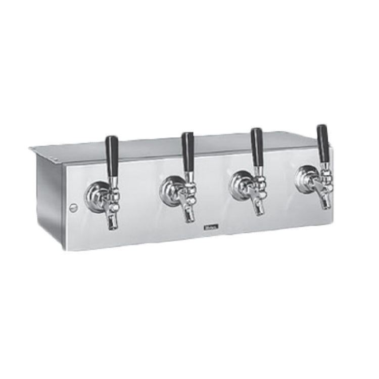 The Perlick 4040A4B-BTM Space Saver Draft Beer Dispenser Underbar 13"W x 5-3/4"H Face is a specialized unit designed for seamless integration into a space-efficient bar setup. Featuring a glycol-cooled system, this dispenser can accommodate four polished chrome faucets, making it a versatile option for establishments serving a variety of draft beers. Each Perlick tower includes 630SS faucets, and where applicable, 630SSTF faucets on TF Brass and Gold Towers, ensuring high-quality dispensing performance. The dispenser's compact dimensions of 13 inches in width and 5-3/4 inches in height are tailored for underbar installation, offering significant space-saving advantages. It boasts a stainless steel body, providing durability and easy maintenance in high-traffic environments. The beer line leads out from the bottom, optimizing the flow and reducing clutter. With an overall width of 14 inches, this product must be integrated as part of a full Century system quote, as it cannot be ordered standalone, emphasizing its compatibility and specialized use in complex system setups. The Perlick 4040A4B-BTM is an ideal choice for bars and restaurants looking to maximize their draft beer service capabilities within limited spaces.