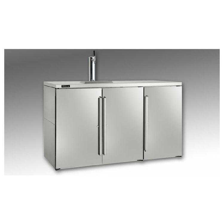 The Perlick BBRN60 Narrow Door Refrigerated Back Bar Cabinet - three-section, 60"W is an expertly engineered refrigeration solution, perfect for various hospitality and commercial environments. With a spacious interior volume of 19.0 cubic feet, it efficiently accommodates a wide selection of beverages. The cabinet features three hinged doors equipped with locks, ensuring security and ease of access for bar staff. Its LED interior lighting enhances visibility, allowing for quick, effortless inventory checks. The remote refrigeration system supports seamless integration into professional setups, minimizing noise and heat emissions in the main customer area. The field-plumbed condensate evaporator includes a floor drain, ensuring effective moisture management and preventing water buildup. Constructed with a robust stainless steel interior, this unit is designed for durability and longevity, able to withstand the demands of high-traffic environments. Perlick BBRN60 holds NSF certification and cULus listing, meeting the stringent standards for safety and sanitation. This refrigerated back bar cabinet is an ideal choice for bars, restaurants, and hospitality establishments looking to enhance their beverage service with a reliable, high-capacity refrigeration unit.